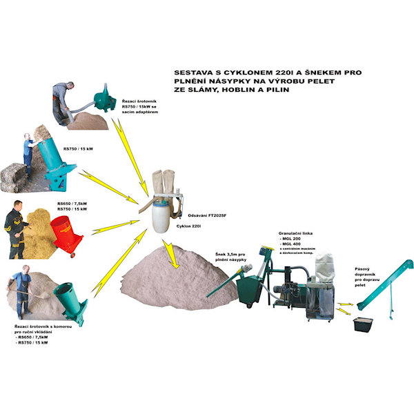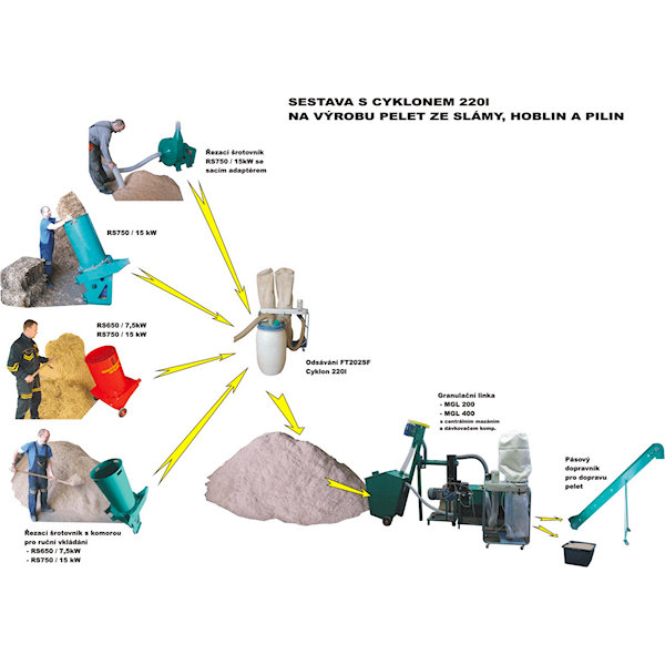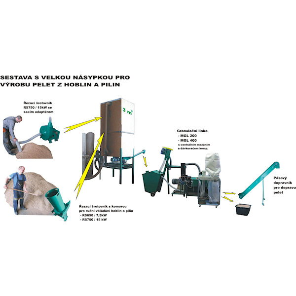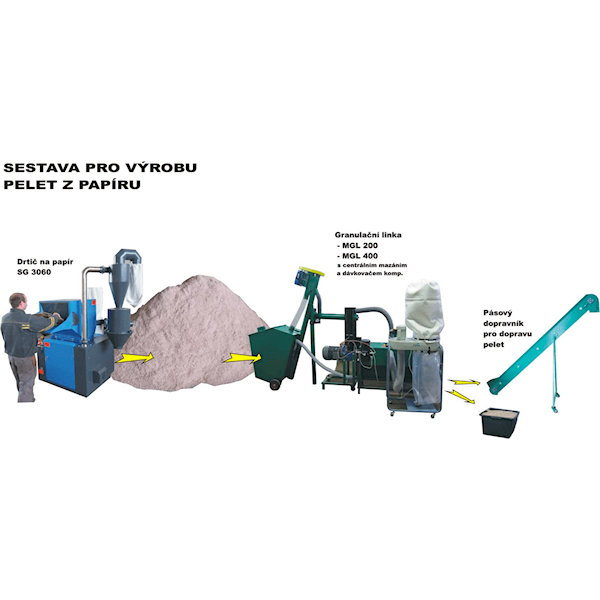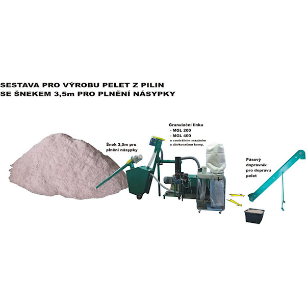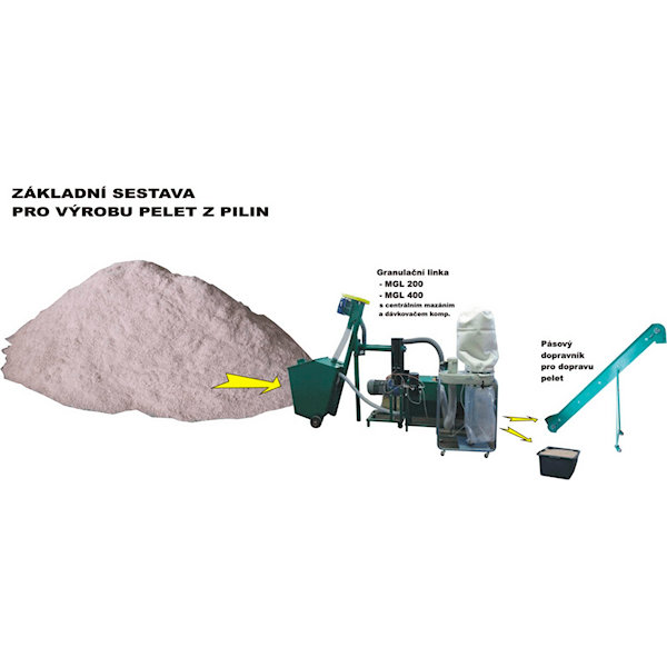 Linka na výrobu peliet sa skladá z dávkovacieho šneku s uzavretou násypkou. Do násypky sa nasype materiál na granulovanie. Špeciálny šnek vynáša materiál k dávkovaciemu otvoru, ktorým presne nastavená dávka hmoty prepadáva do miešacieho zariadenia. Zvyšok hmoty sa prepadom odvádza späť do násypky, takže stále cirkuluje slimákom, prepadom a násypkou v uzavretom okruhu. Hmota, ktorá prešla dávkovacím otvorom do premiešavača hmoty sa v ňom môže zmiešať s ďalšími pridávanými komponentmi, napariť parou alebo zvlhčiť vodou a ďalej prepadáva priamo na granulačné kolesá granulátora, kde pri vysokom tlaku a teplote dochádza k čiastočnej plastifikácii granulovaného materiálu priechodom cez granulačnú matriku. Plynulým pretláčaním vstupnej suroviny kanálikom matrice pri určitom tlaku dochádza k vzniku súdržných valčekov – peliet, granúl. Pelety prepadávajú do triedičky, v ktorej sa od granúl separuje prach a neštandardné granule. Pelety sa priechodom triedičkou zároveň aj ochladia, čím sa zabráni ich neskoršiemu rozpadávaniu vplyvom prehriatia. Neštandardné granule a prach sa vracajú späť špirálovým šnekovým dopravníkom do násypky a opätovne prechádzajú peletizačným procesom. Hotové granule vypadávajú z triedičky do pripraveného zásobníka. Na prevádzku linky MGL200 plne postačuje hlavný istič 25A .