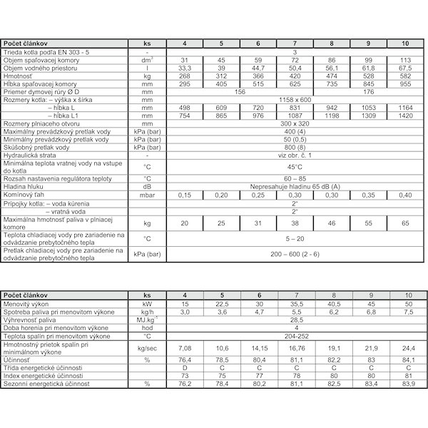 Výkonové rady kotlov (podľa počtu článkov na koks):